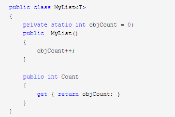 该例中,我创建了一个称为MyList泛型类。为把它参数化,我简单地插入了一个尖括号。在<>内的T代表了实际的当使用该类时要指定的类型。在MyList类中,定义了一个静态字段objCount。我在构造器中增加它的值。因此我能发现使用我的类的用户共创建了多少个那种类型的对象。属性Count返回与被调用的实例同类型的实例的数目。