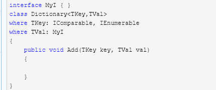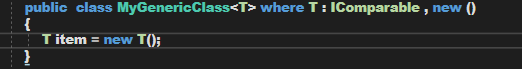 你可以指定约束的组合,就象: where T : IComparable, new()。这就是说,用于参数化类型的类型必须实现Icomparable接口并且必须有一个无参构造器。