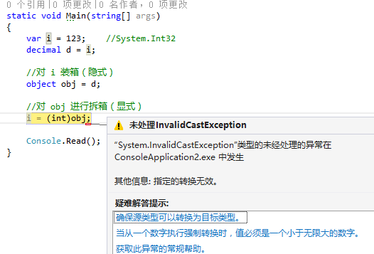 虽然,decimal 类型可以直接强转为 int 类型,但从调式的结果来看,拆箱时是会引发“转换无效”的异常。要记住,拆箱时强转的值类型,应以装箱时的值类型一致。