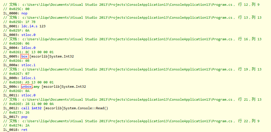 直接通过反编译得到的 IL 代码,从 box 和 unbox 这两个指令也可以看出具体在哪一步发生装箱和拆箱操作。