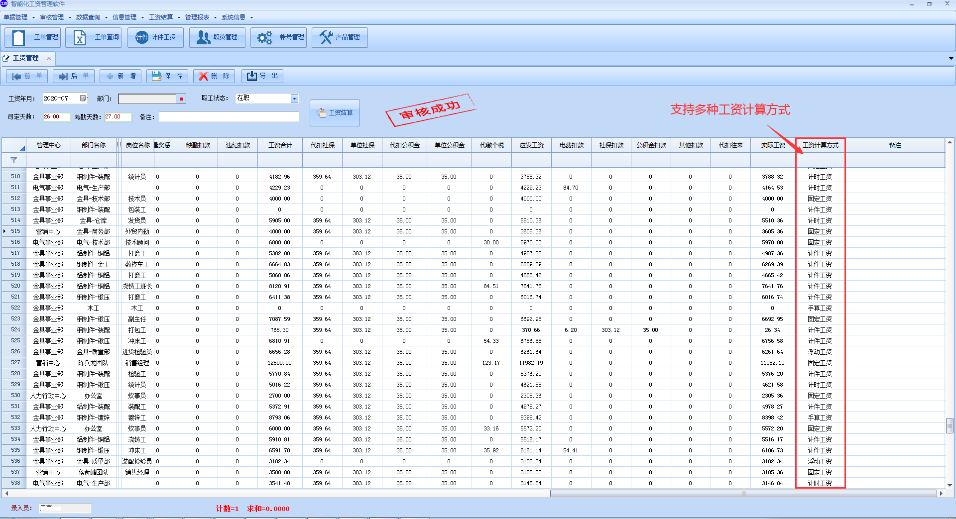 支持多种工资计算方式(计件工资、计时工资、固定工资、浮动工资、手动工资等)
